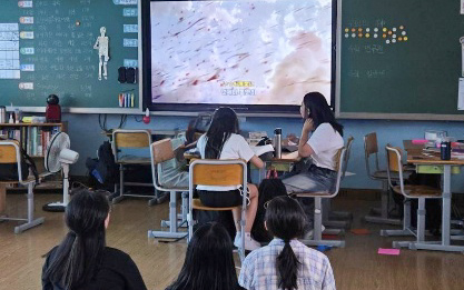 給食後の休み時間には、教室で『進撃の巨人』や『推しの子』のミュージックビデオがYouTubeで流れ、子どもたちが楽しそうに見ていました。中には、「心臓を捧げよ!」と『進撃の巨人』のセリフを日本語で口にする児童の姿も見られ、日本のアニメや音楽がすでに身近な存在になっていることを改めて感じました。